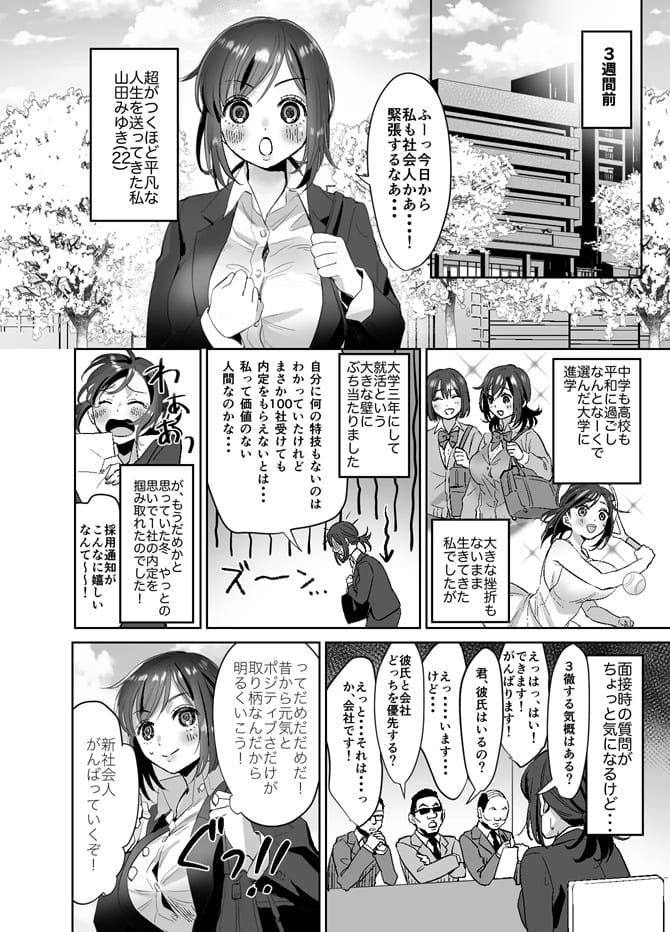 今作は営業として新卒社員で頑張るヒロインが「営業で体を使うのが当たり前」と徐々に毒されていくような姿を描いています。彼氏がいるのに、素直な主人公がセクハラを受け、営業にも体を使っていくような様子が自然に描かれており、このような形で毒されてしまう人もいるのではないかという臨場感が非常によくできている作品です。作品としての魅力は高い一方で、NTR視点としては彼氏との描写が少なく、かつ自身で自然と落ちていくような感じなので、一般的な寝取られ感は弱めになっている印象もあります。詳しく作品の感想とともに取り上げていきます。